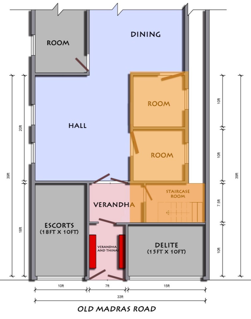 Behind DELITE stores was a veranda and the staircase room leading to the open terrace. Apart from these two, there were two more rooms behind the staircase room that had to be included for the proposed expansion (shaded brown in the image). Hence, I decided to build a first floor with three rooms and a bathroom to make good for the rooms in the ground floor that we had to let out. This way we would not only get additional rent but also have additional rooms on the first floor. This would enable me to shift to first floor making my living more independent!